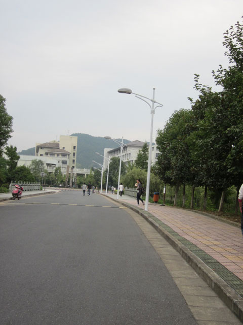 My commute starts about 12 minutes before class begins. (C’mon now, no reason to arrive early.) I go downstairs to my bike which I keep under the stairs in the apartment building (where it stays dry and safe). I put my stuff in the basket, unlock the lock, and head out the door. I often see the (very friendly) cleaning lady as she prepared to mops the floors in the stairwell and we say good morning. (Or she says something and I say good morning. She’s a local person and I have never been able to understand her Chinese.)