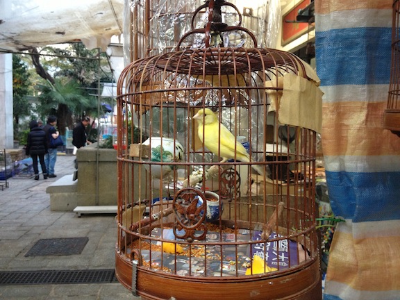 The bird market is located in a little park with lots of free birds. I felt like that was a little mean to these caged birds, especially as the wild birds were eating the seed all around the caged birds cages.